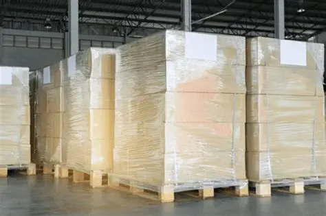 industrial packaging warehouse with stretch film wrapped pallets and carton boxes high resolution"